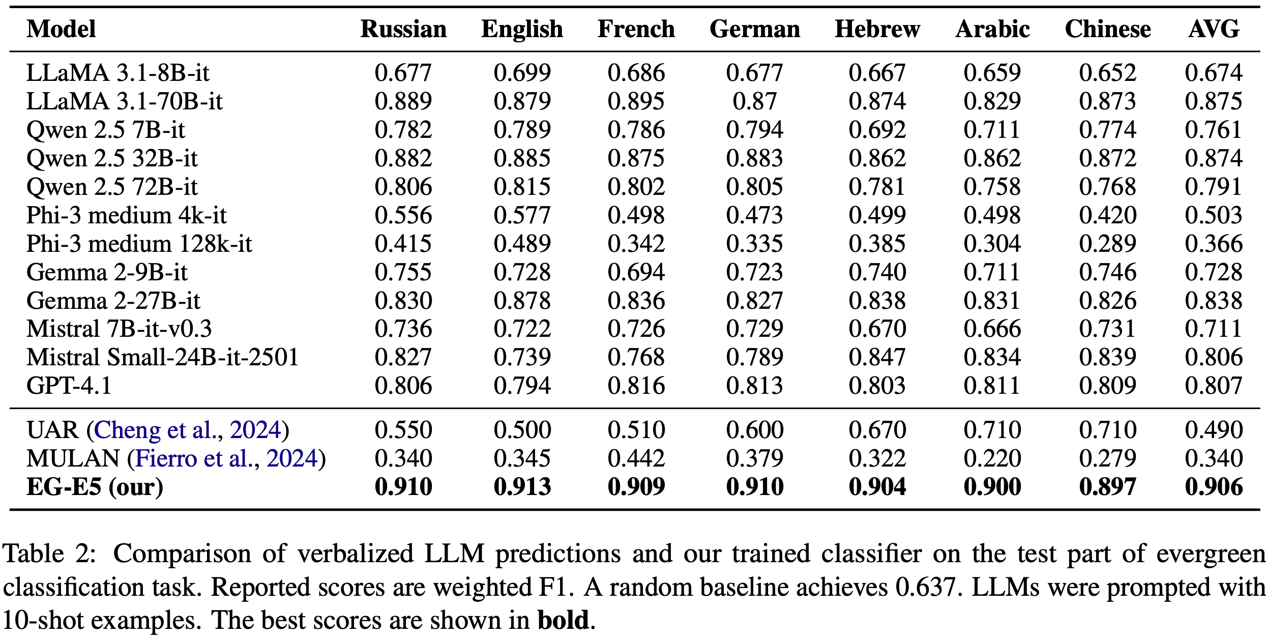 - 结果 :表2显示,论文提出的分类器 EG-E5 在所有语言中均表现最佳,显著优于通用LLM和专门训练的模型