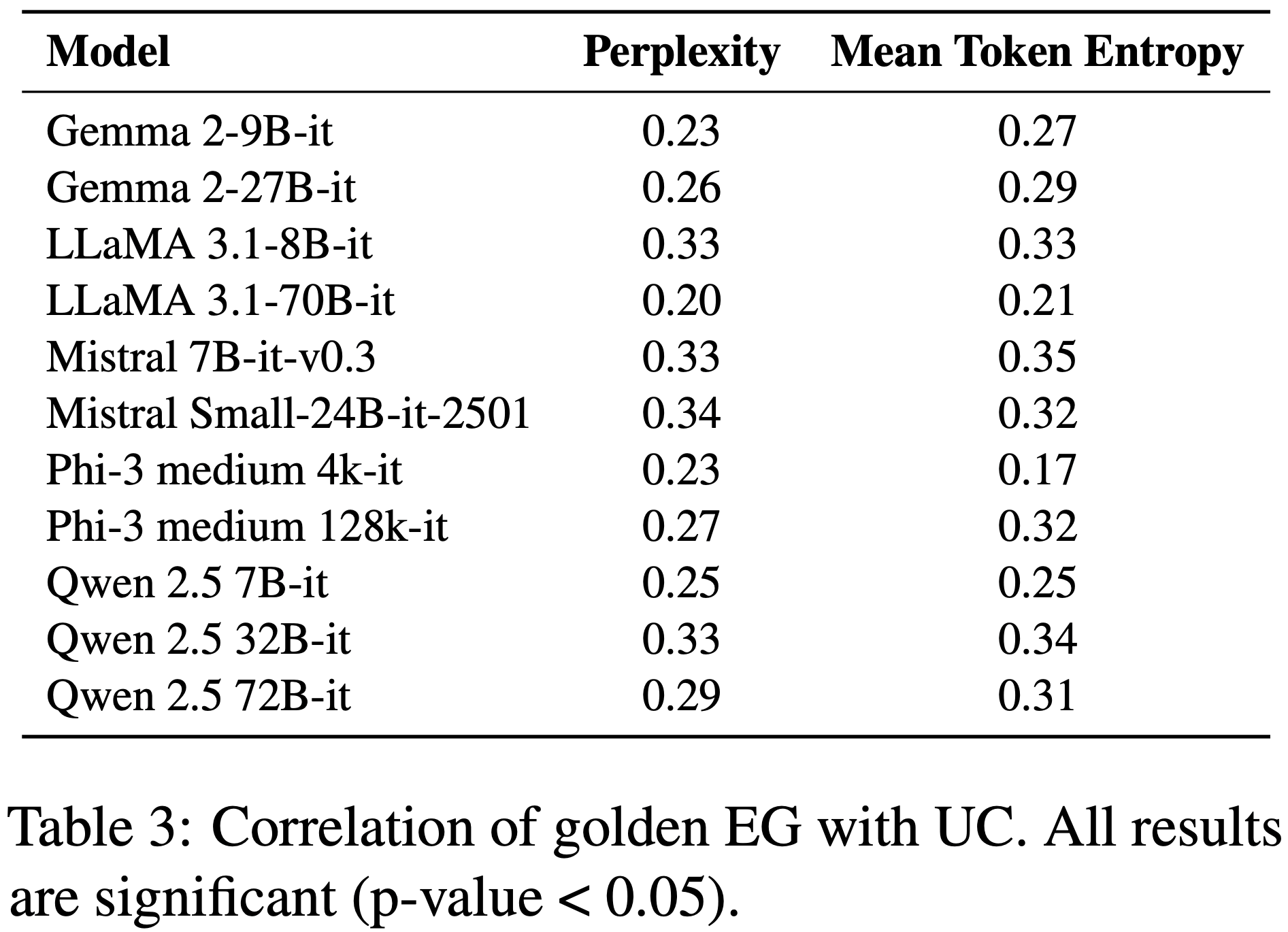 - 结果 :表3显示,大多数模型的不确定性与常青性仅呈现弱相关性(mild correlations),其中 Mistral 7B 和 Qwen 2.5 32B 的信号最强