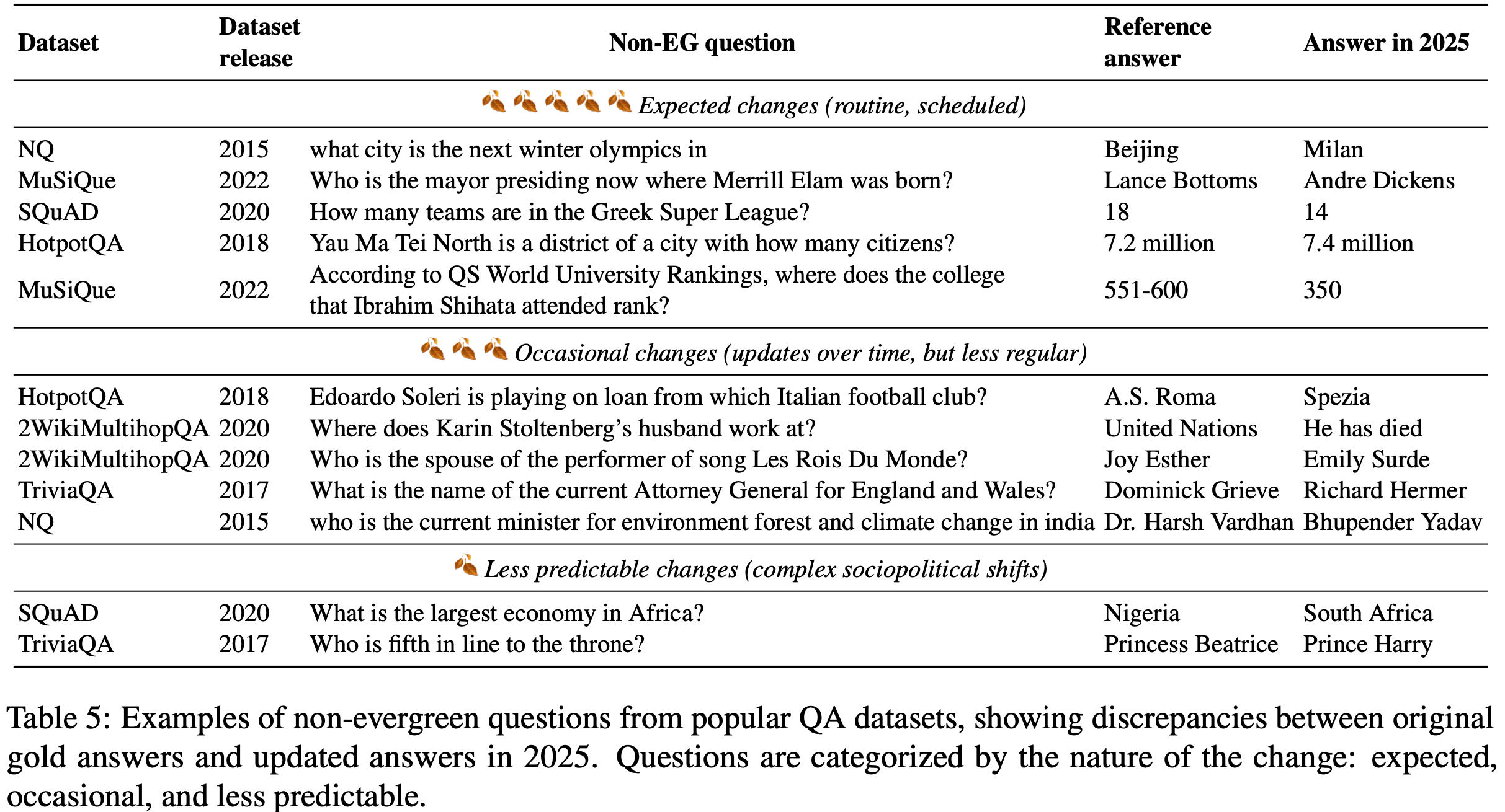 - 论文构建了一个问答数据集,包含来自 AI 聊天助手的真实用户查询,每个问题标注为常青或可变,并提供对应的标准答案