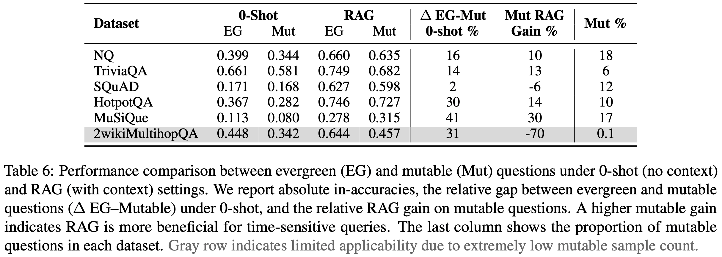 - 论文从测试集中随机抽取 100 个问题(50 个可变,50 个常青)进行评估