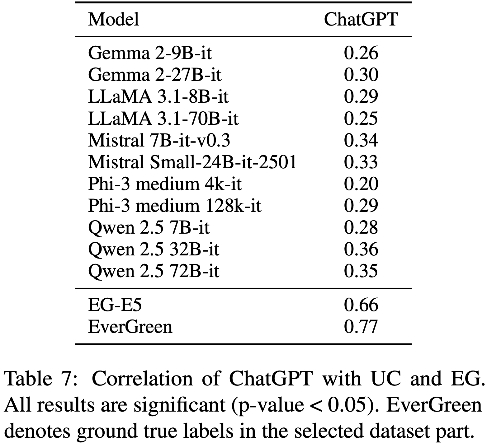 - 最佳性能由 E5-Large 模型实现,论文将其称为分类器 EverGreen-E5 (EG-E5)