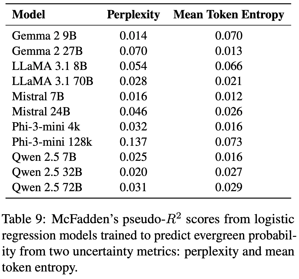 - 表9 报告了逻辑回归模型的 McFadden’s pseudo-\(R^2\) value , 该模型基于两种不确定性指标(困惑度(perplexity)和平均 Token 熵(mean token entropy))预测问题是否为常青(evergreen)