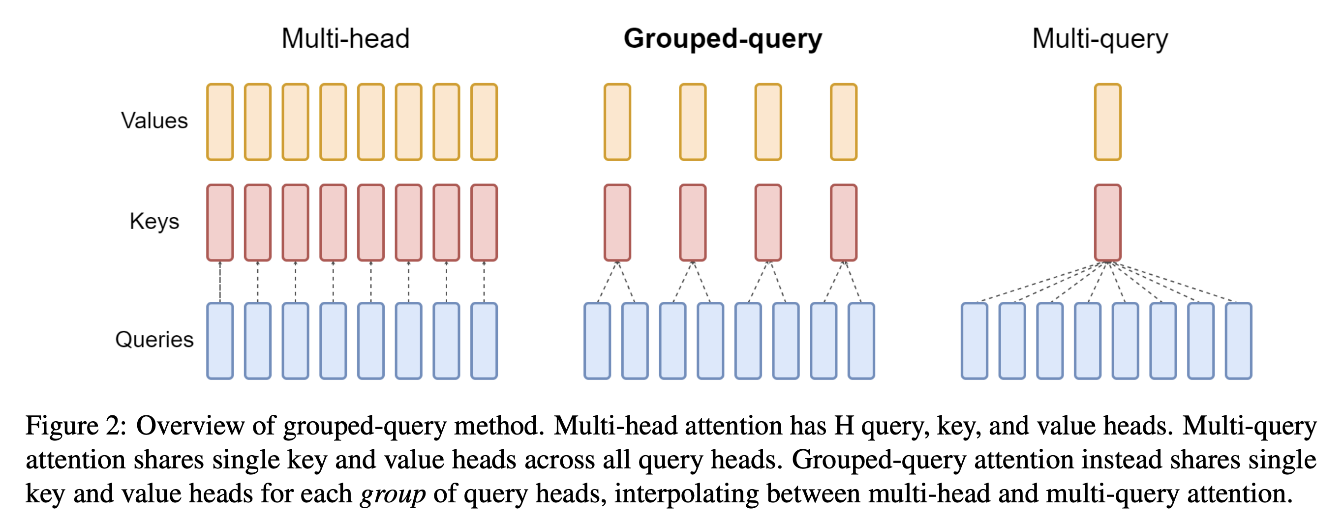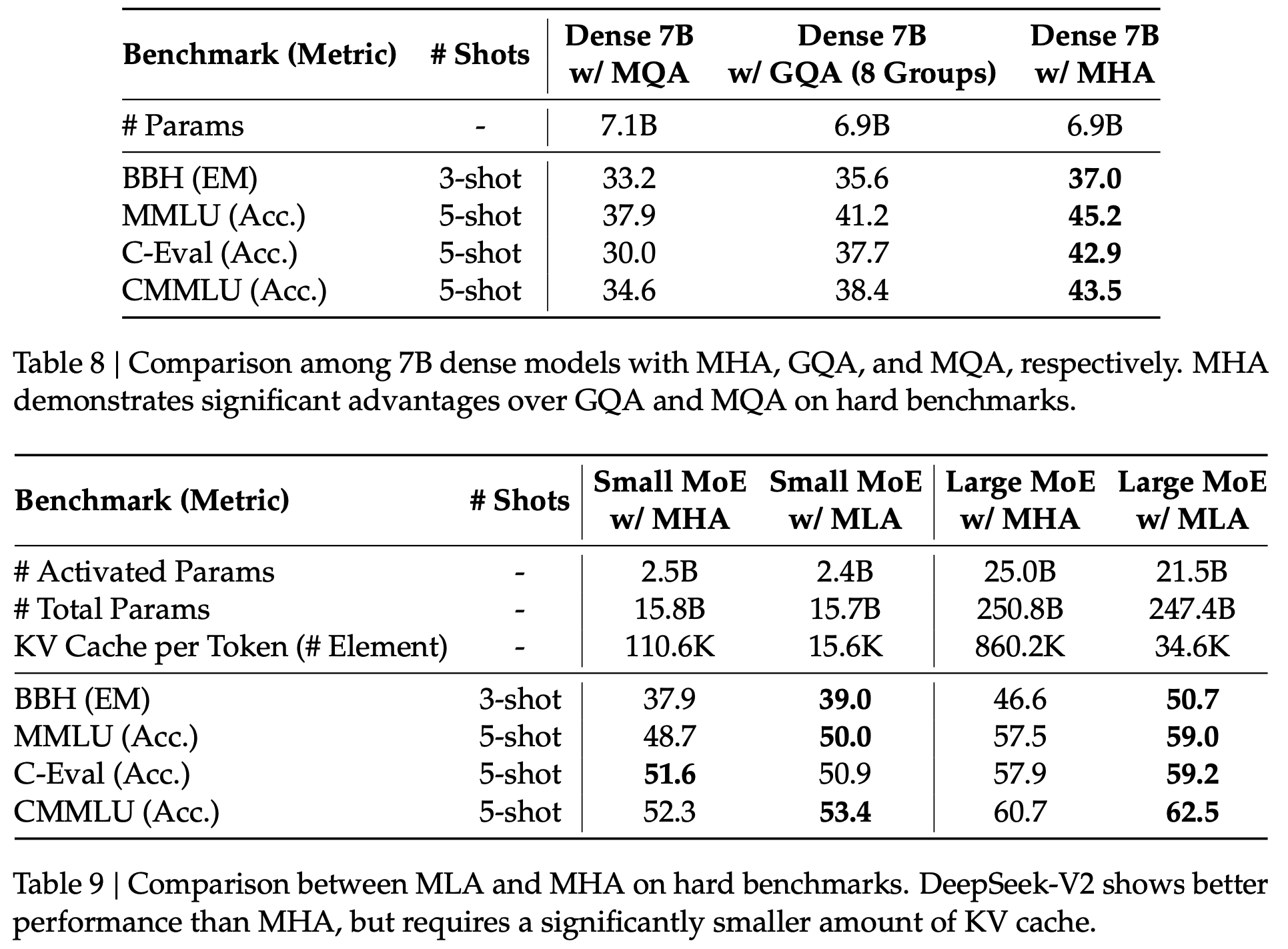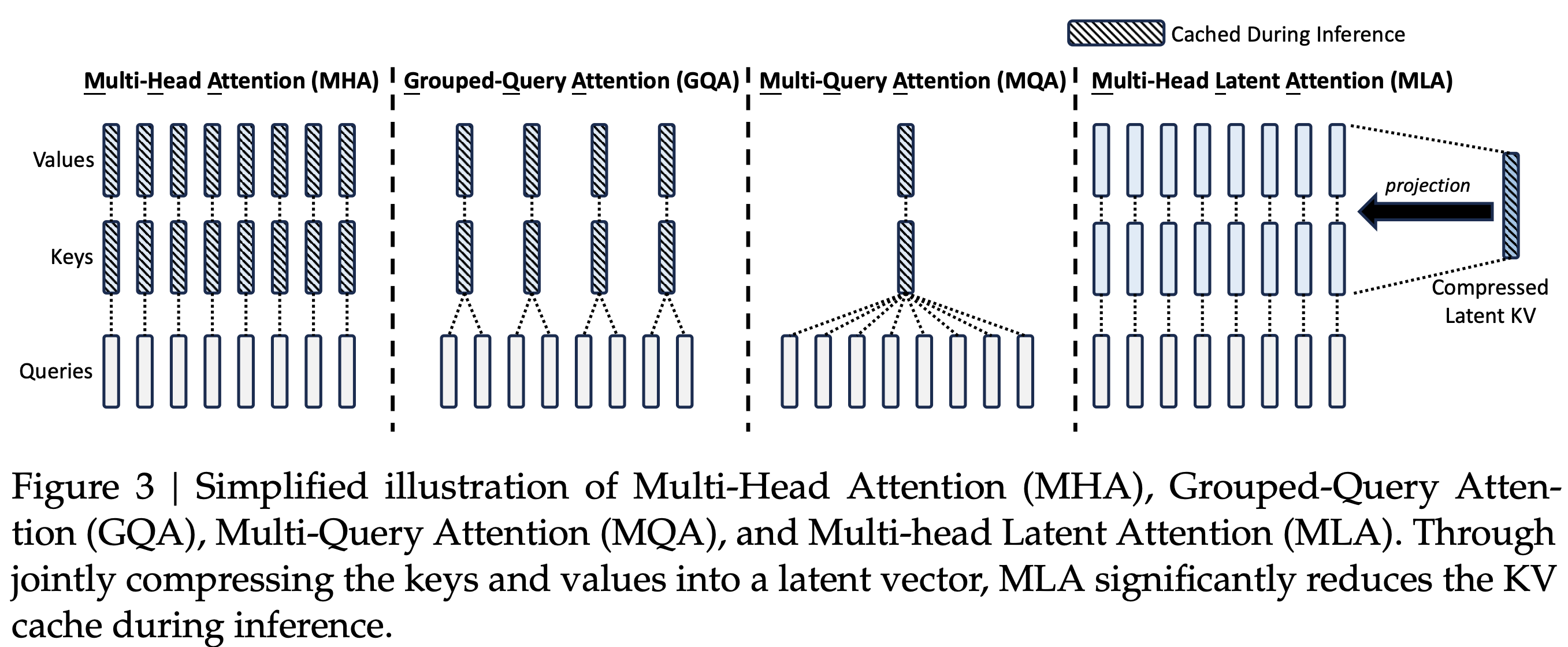• 核心思想是通过将K,V降维再升维的方式,既保证了每个head有不同的K,V,又能显著降低缓存量,巧妙的减少KV-Cache存储量(仅存储降维后的中间值即可),最早由DeepSeek提出