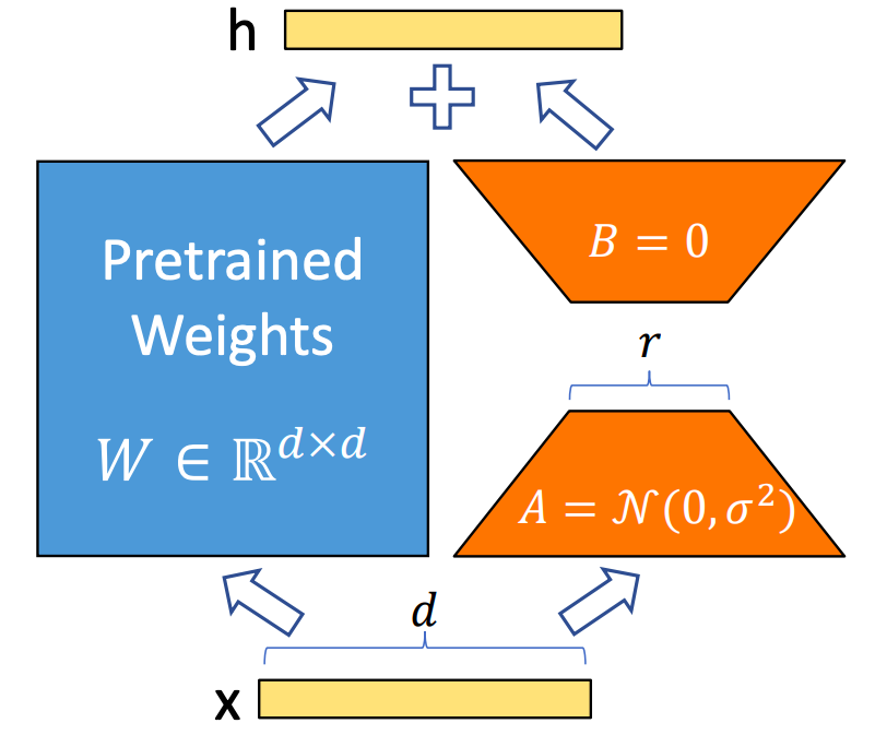 $$h = W_0 x + \frac{\alpha}{r}\Delta W x = W_0 x + \frac{\alpha}{r}BAx$$
