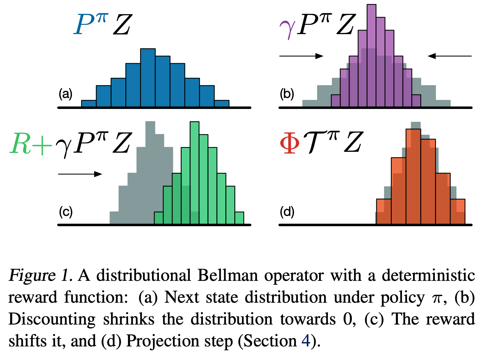 - 可以证明,在Wasserstein metric下证明了 Distributional Bellman Operator 是一个 \(\gamma\) -压缩( \(\gamma\) -contraction)算子,从而确保该算子存在不动点