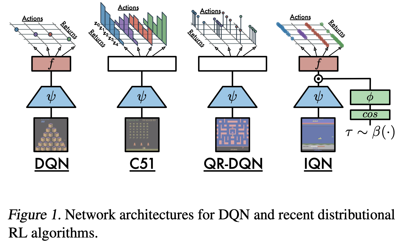 - 常见算法:包括C51,QR-DQN,IQN等,各种不同值分布强化学习算法的网络结构对比见下图: