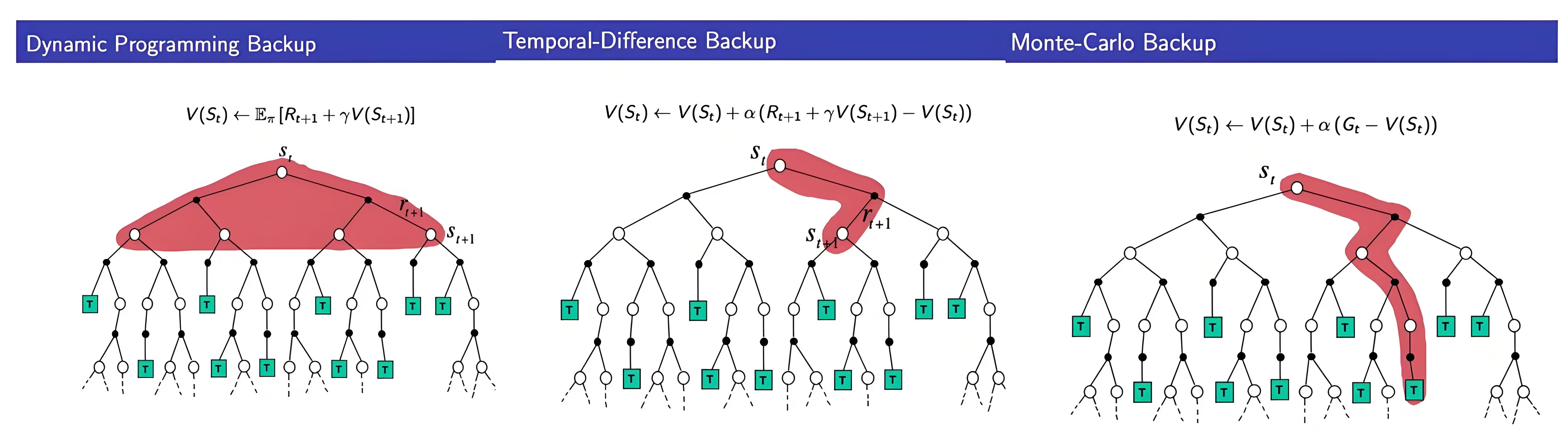 • 使用当前回报和下一时刻的价值预估来更新当前时刻的价值(和DP方法一样);不需要知道状态转移矩阵,也不需要full-width回溯(不同于DP方法)
