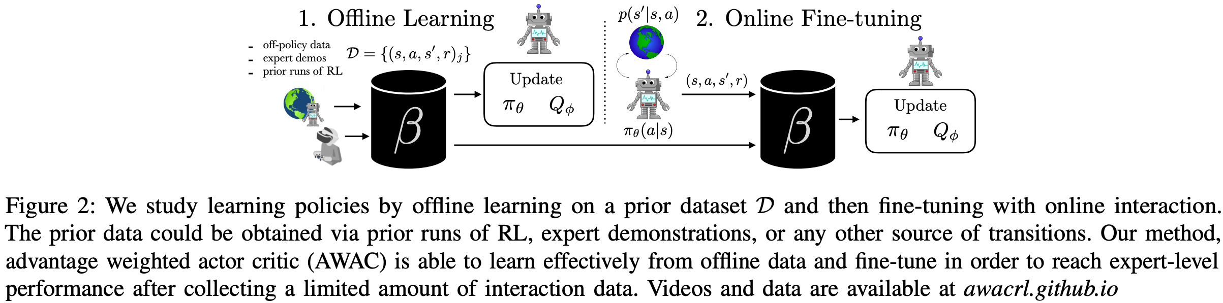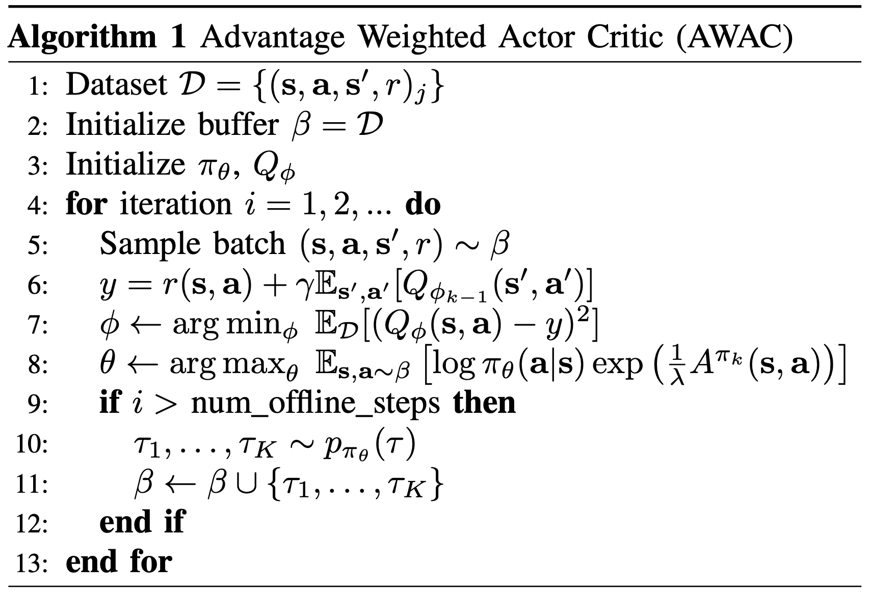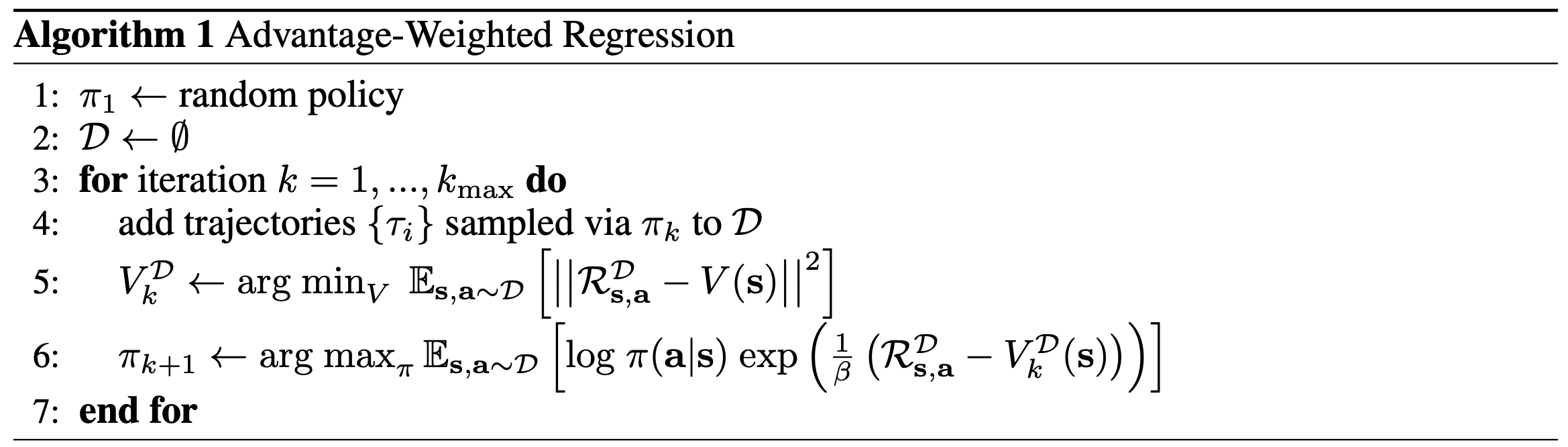 $$ J(\theta) = \mathbb{E}_{(s,a) \sim \mathcal{D}} \log \pi_\theta(a|s)exp(\frac{1}{\lambda}\hat{A}^{\pi}(s,a)) $$