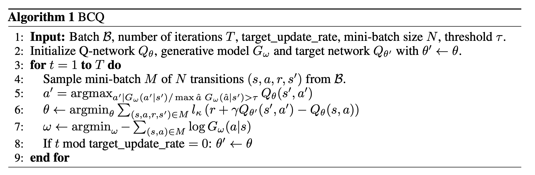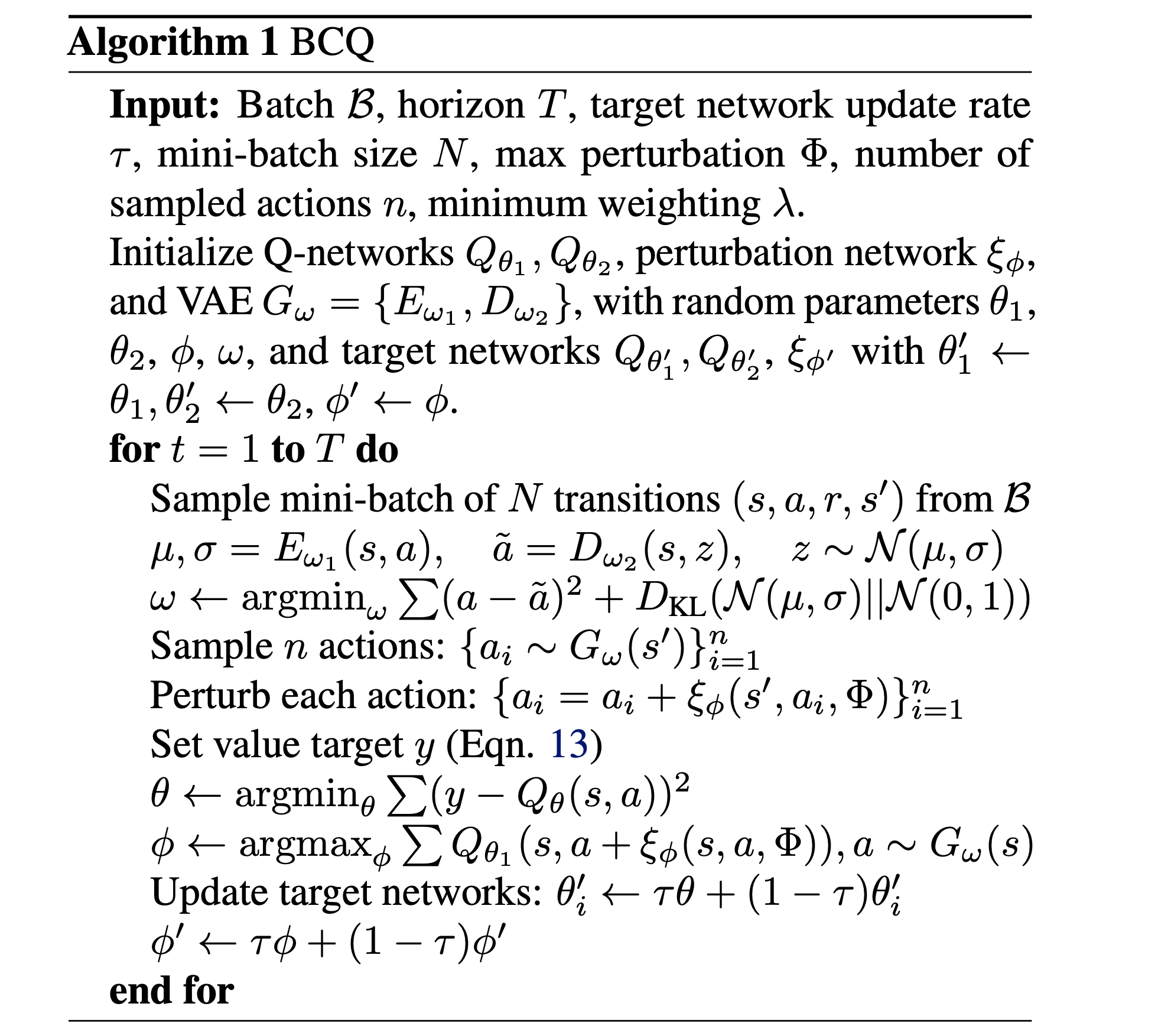 - 相对普通的DQN,主要改进点在于学习Q的目标值选择时动作受到限制,动作与行为策略(离线数据集)的动作差异不能太大