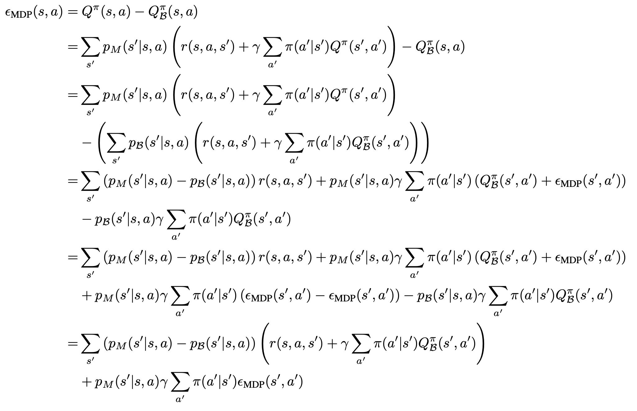 $$\epsilon_\text{MDP}(s,a) = Q^\pi(s,a) - Q_{\mathcal{B}}^\pi(s,a)$$ - 则有外推误差可推导得到如下结论: