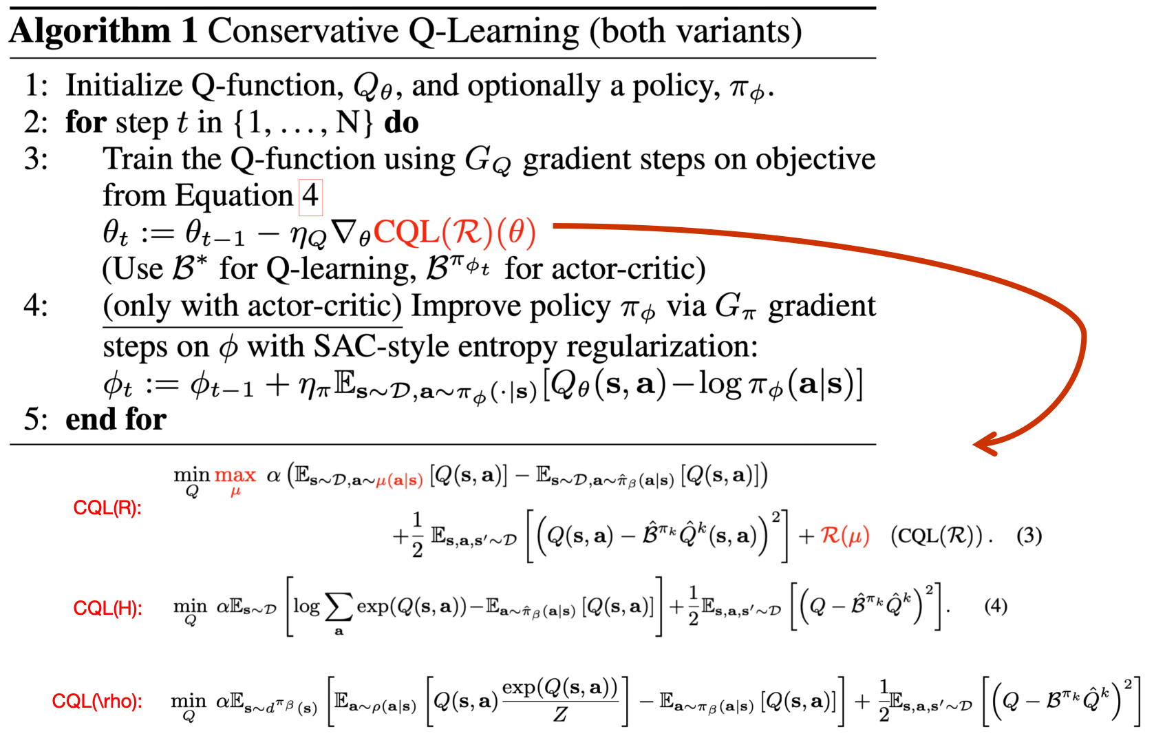 伪代码流程如下,其中CQL(\(\mathcal{R}\))可以是CQL(\(\mathcal{H}\)),也可以是CQL(\(\mathcal{\rho}\)):