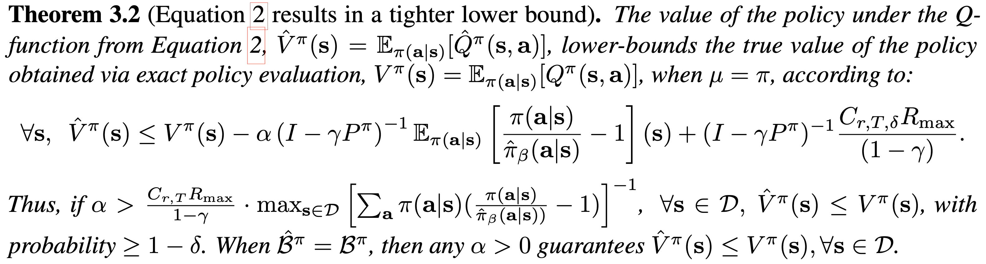 $$\hat{Q}^{k+1} = \mathop{\arg\min}_Q \color{red}{\alpha} \left(\mathbb{E}_{s\sim \mathcal{D}, a\sim \mu(a\vert s)}[Q(s, a)] - \color{red} { \mathbb{E}_{s\sim \mathcal{D}, a\sim\hat{\pi}_\beta(a\vert s)}[Q(s, a)] } \right) + \frac{1}{2} \mathbb{E}_{\mathbf{s}, \mathbf{a}, \mathbf{s’} \sim \mathcal{D}}\left[\left(Q(\mathbf{s}, \mathbf{a})-\hat{\mathcal{B}}^{\pi} \hat{Q}^{k}(\mathbf{s}, \mathbf{a})\right)^{2}\right]$$这里论文中给出了证明(Theorem 3.2):