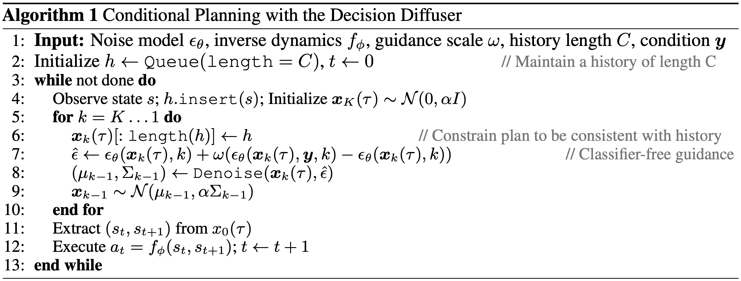 - Decision Diffuser算法伪代码如下: