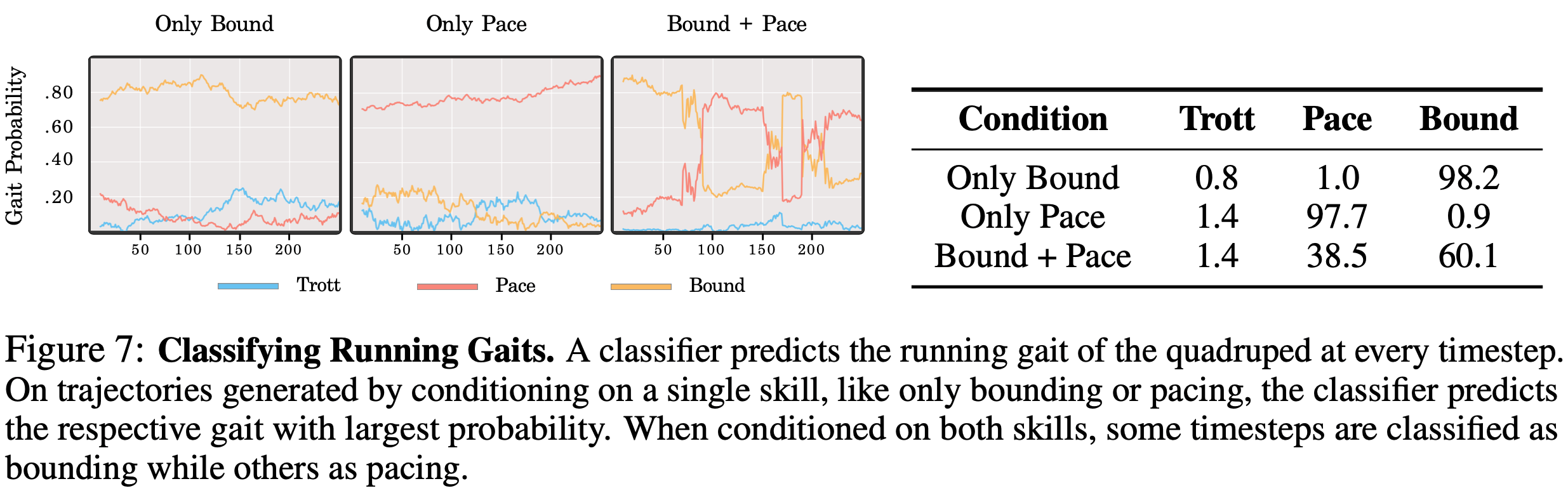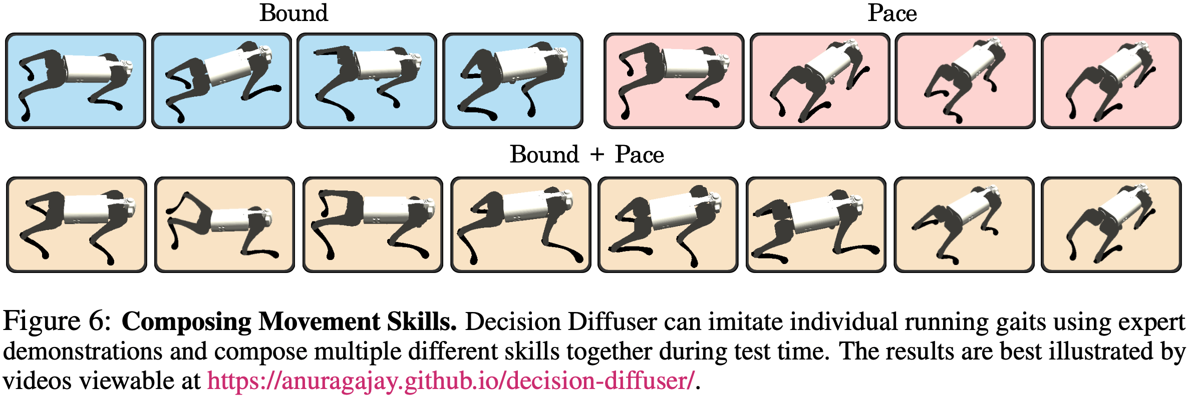 - 在数据集中收集包含单一技能的轨迹,然后让机器人学习各种步态,如跳跃 (bounding) 、踱步 (pacing) 和小跑 (trotting)