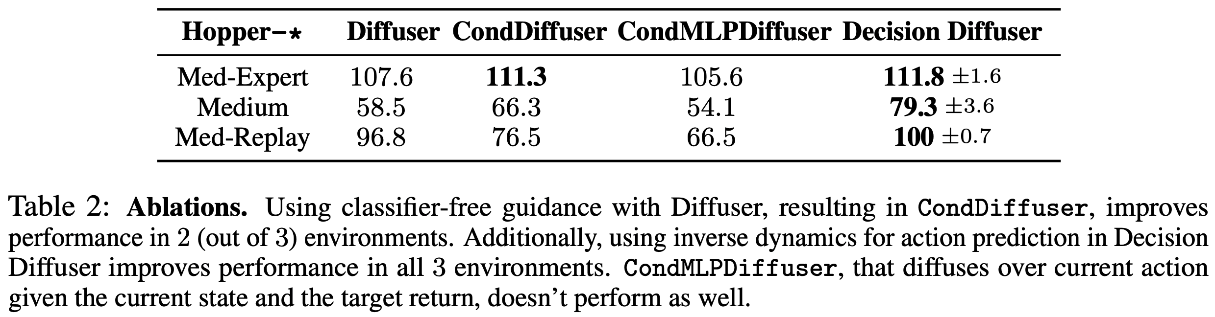We also compare against CondMLPDiffuser, a policy where the current action is denoised according to a diffusion process conditioned on both the state and return