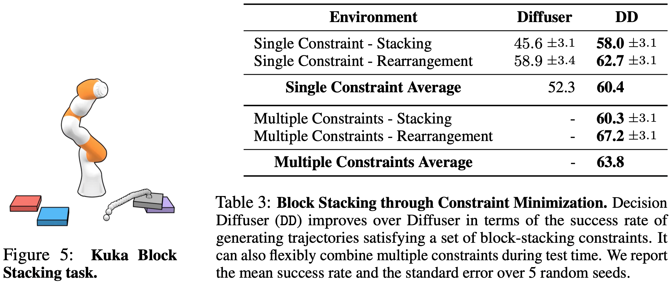 - 其他说明:Decision Diffuser支持约束的“与”运算和“非”运算(做减法),但是不支持或运算(Decision Diffuser 没有为每个条件变量提供显式的密度估计,因此它不能原生支持“或”运算组合)