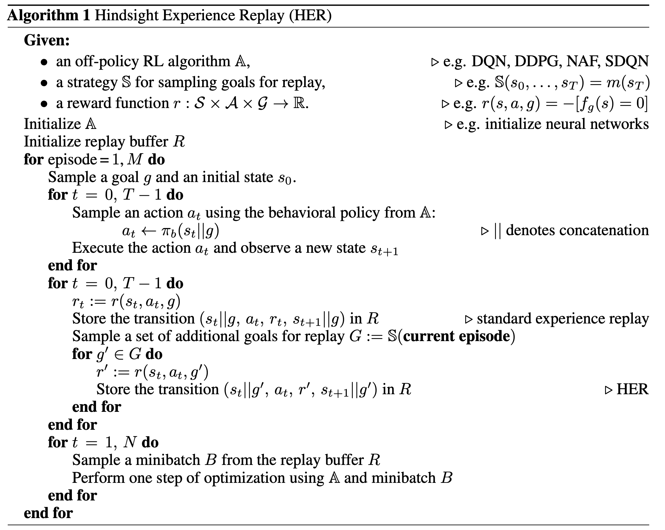 - HER对经验池进行了扩充,不仅存入实际采样得到的transition/experience, \(\left ( s_{t}||g,a_{t},r_{t},s_{t+1}||g \right )\),也要在回合结束时重新设置目标状态,得到相应的奖励值(在二分奖励问题中,只有在 \(s=g\) 时奖励才需要更改),存入“事后”(当初如果这样就好啦!)的经验 \(\left ( s_{t}||g’,a_{t},r_{t}’,s_{t+1}||g’ \right )\),详见伪代码,这个事后经验究竟存入多少份、多少种,由超参数 \(k\) 控制,下文讲解