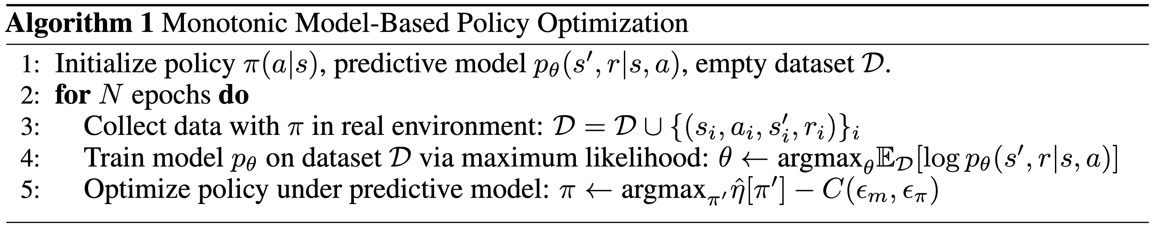 $$ \eta[\pi] = \mathbb{E}_\pi\Big[ \sum_{t=0}^\infty \gamma^t r(s_t, a_t) \Big]$$ - \(\hat{\eta}[\pi]\) 定义为模型返回的累计折扣收益
