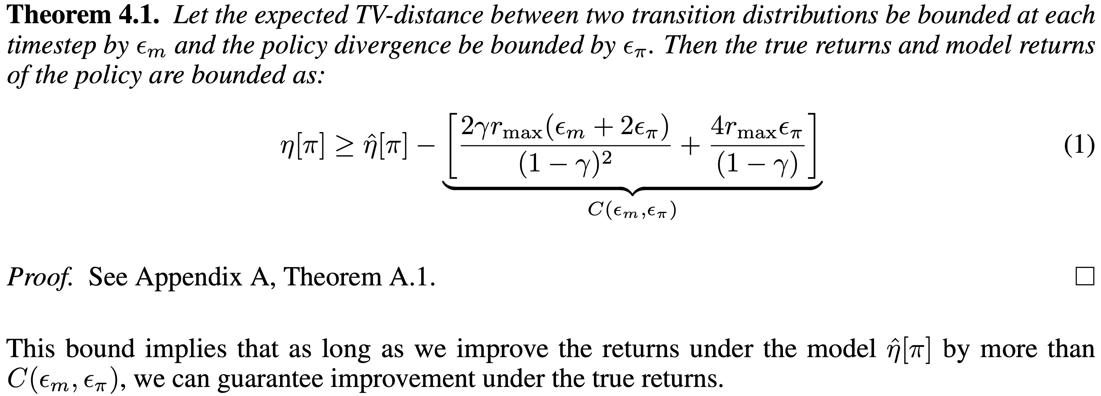 $$ \epsilon_m = \max_t\mathbb{E}_{s\sim \pi_\text{D,t}} [D_{TV}(p(s’,r|s,a)\Vert p_\theta(s’,r|s,a))] $$- \(s\sim \pi_\text{D,t}\) 表示时间步 \(t\) 采样到状态 \(s\)