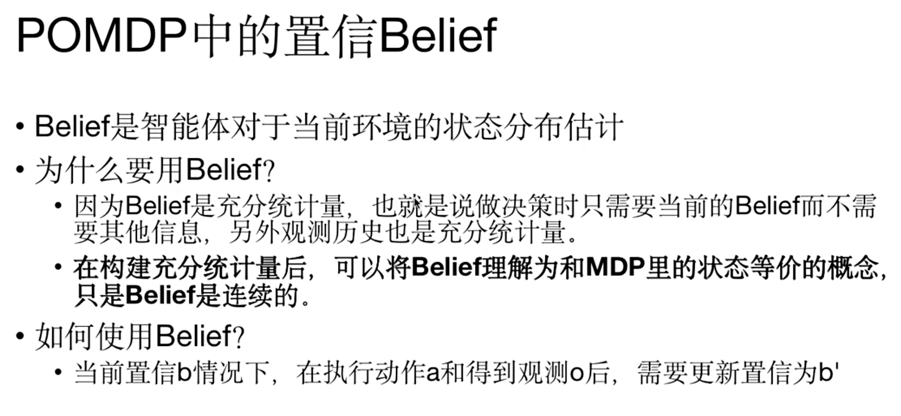 - 使用 Belief 的原因 :因为Belief是充分统计量,也就是说做决策时只需要当前的Belief而不需要其他信息,另外观测历史也是充分统计量。在构建充分统计量后,可以将Belief理解为和MDP里的状态等价的概念,只是Belief是连续的