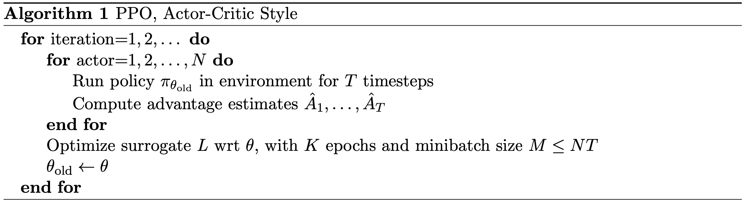 - 每次迭代中,\( N \) 个(并行)执行者各收集 \( T \) 个时间步的数据;然后基于这些 \( NT \) 个时间步的数据构建代理损失,并使用 minibatch SGD (或通常为了更好的性能使用Adam)优化它,进行 \( K \) 轮