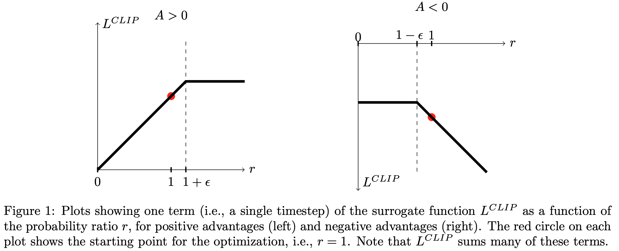 - 图1 绘制了 \(L^{CLIP}\) 中的单一项(即单个时间步 \(t\) )随概率比 \(r\) 的变化曲线