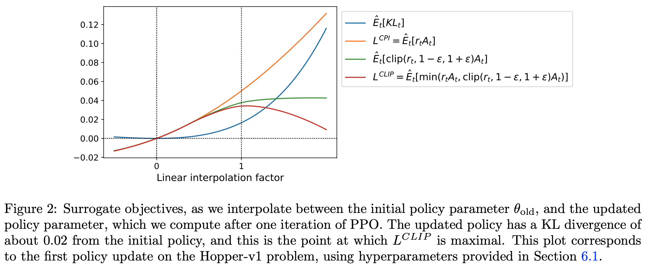 - 图2 展示了代理目标 \(L^{CLIP}\) 的另一种直观解释,显示了在连续控制问题上沿策略更新方向插值时多个目标的变化情况。可以看出, \(L^{CLIP}\) 是 \(L^{CPI}\) 的下界,并对过大的策略更新施加惩罚