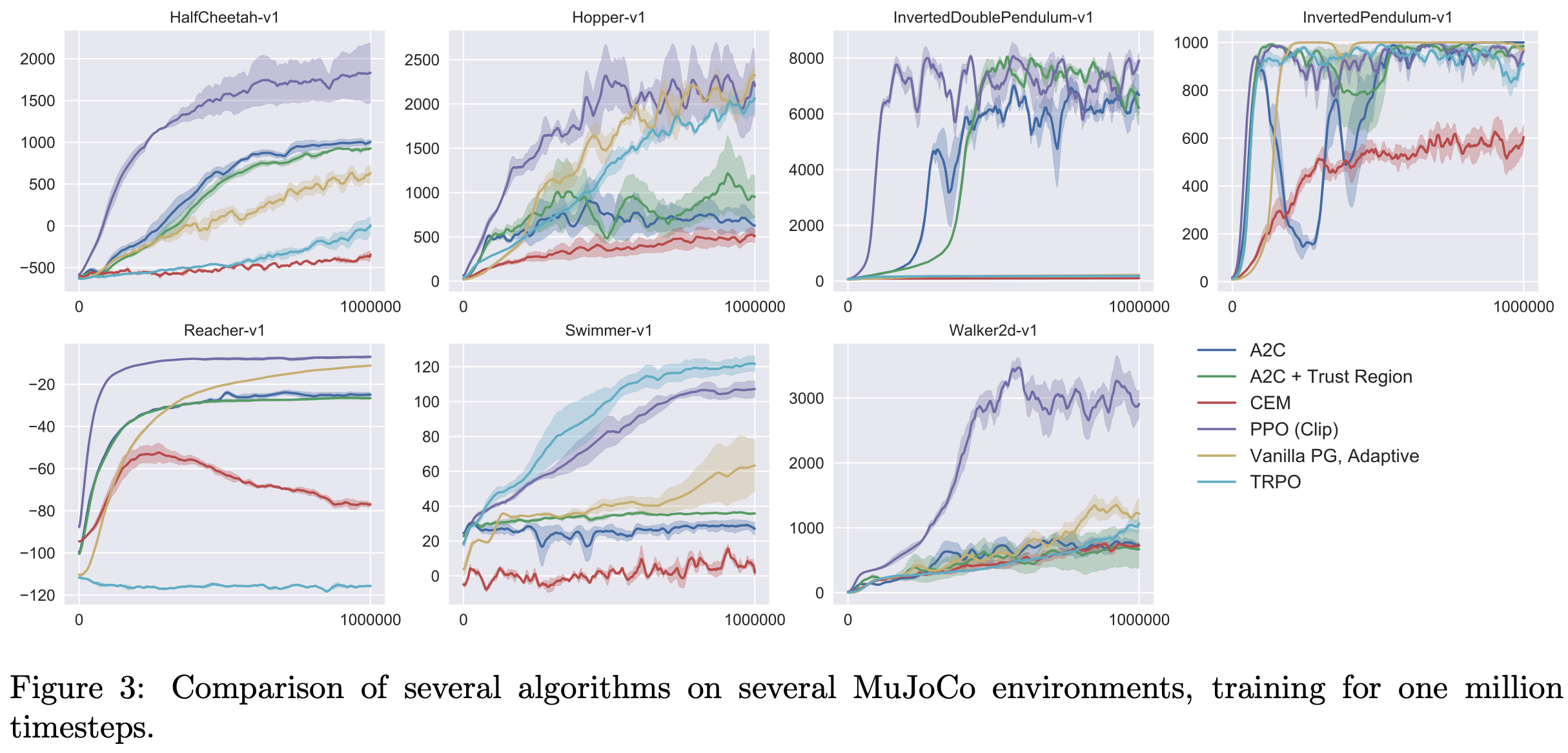 - 对于PPO,论文使用上一节的超参数, \( \epsilon=0.2 \),结果如图3显示,PPO在几乎所有连续控制环境中都优于之前的方法