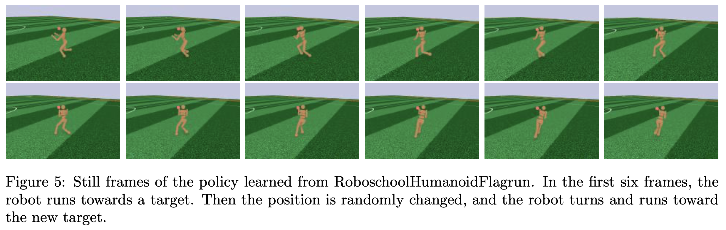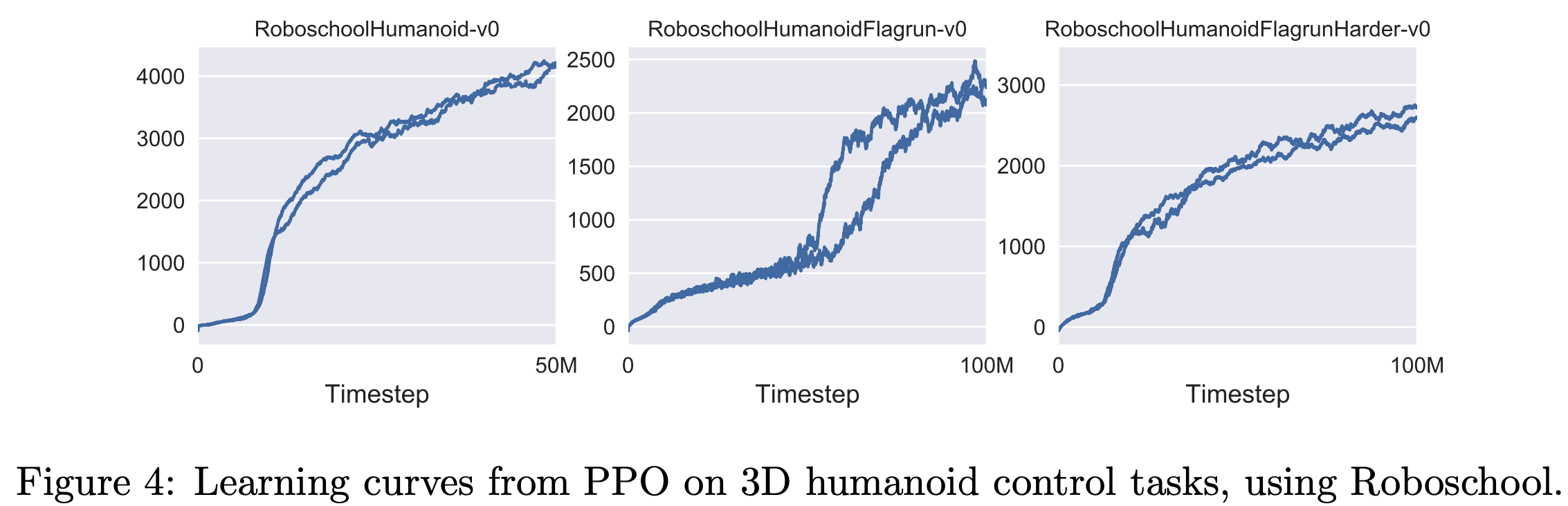 - 为了展示 PPO 在高维连续控制问题上的性能,论文在涉及 3D 人形机器人的任务上进行训练,机器人需要跑步、转向,甚至在被方块击中时从地面爬起