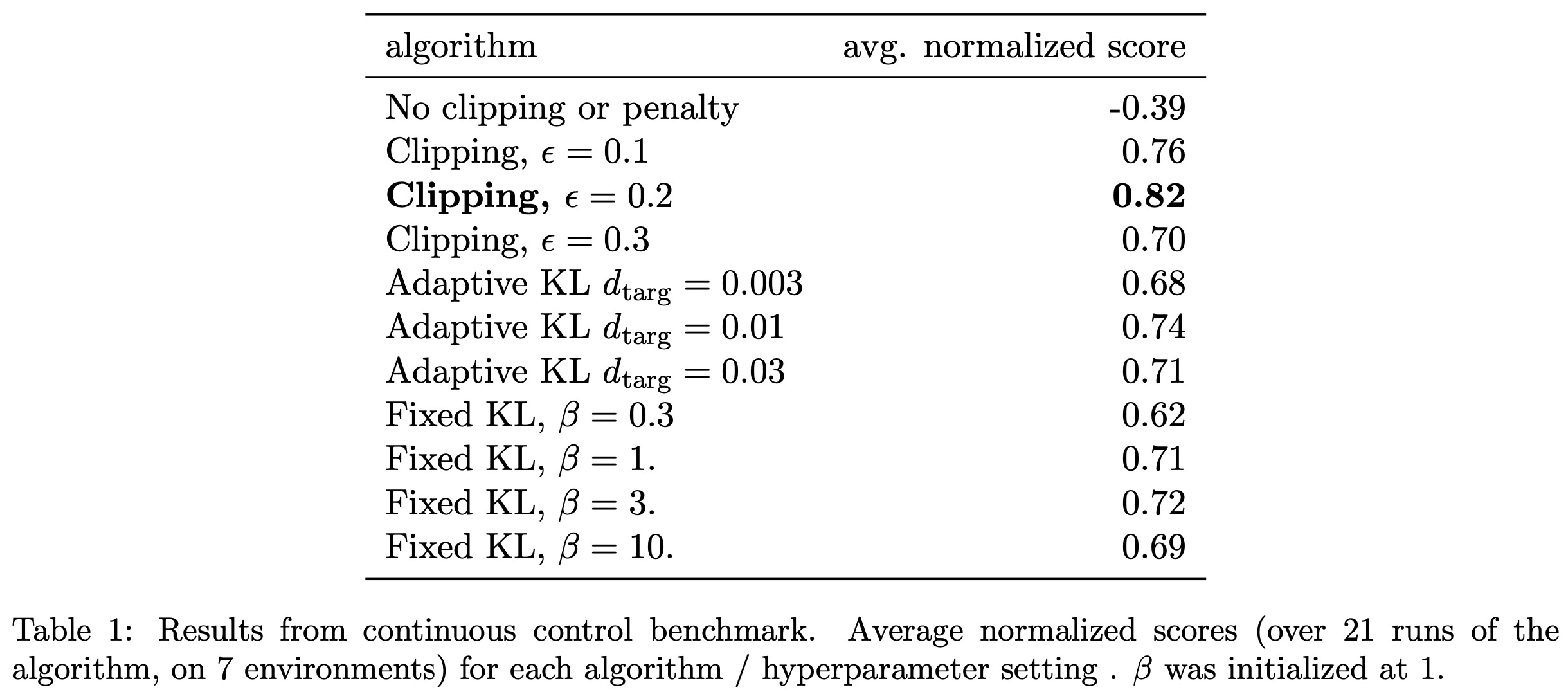 对于KL惩罚,可以使用固定惩罚系数 \( \beta \) 或自适应系数(如第4节所述,目标KL值为 \( d_{\text{target} } \) ),论文还尝试了对数空间裁剪,但发现性能没有提升