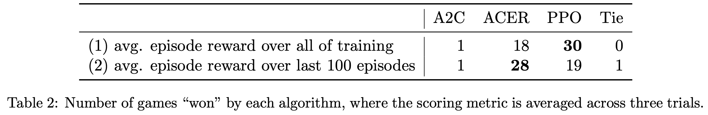 - 表2显示了每种算法“获胜”的游戏数量,其中评分指标是三次试验的平均值