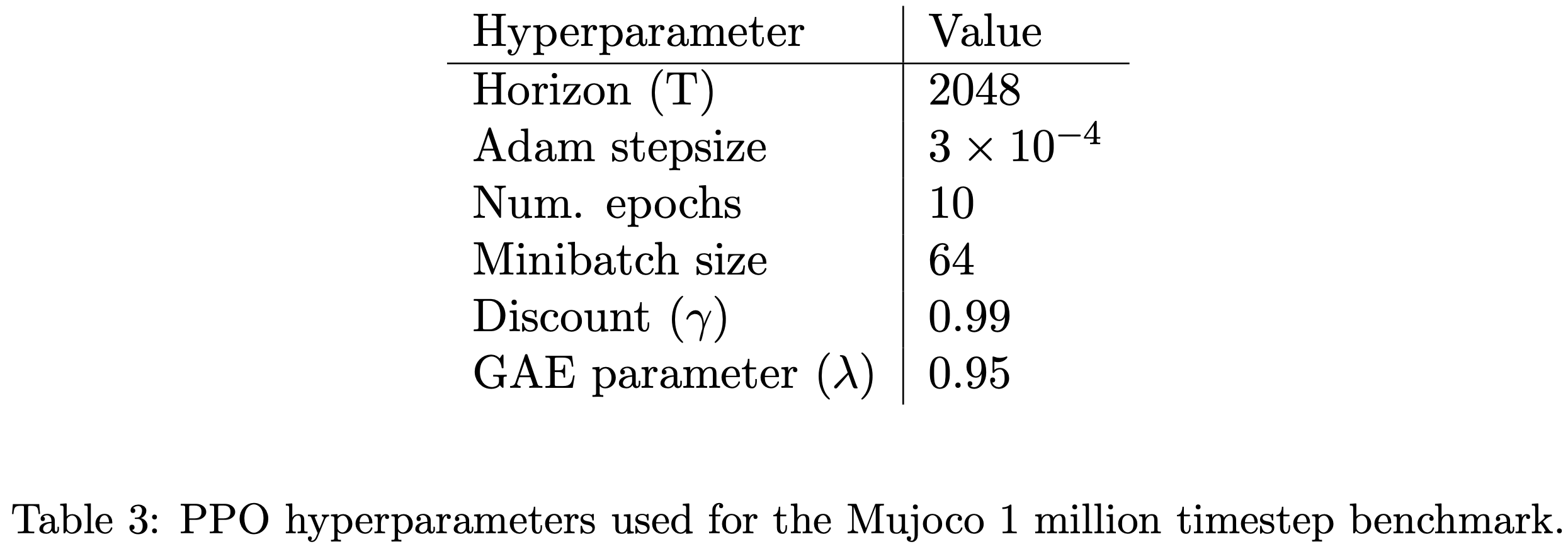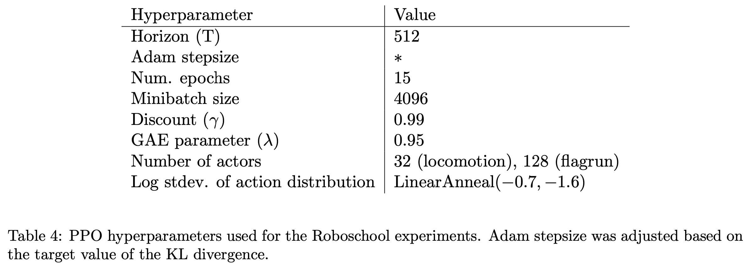 - 超参数见表4,在并行工作中,Heess等人[]使用PPO的自适应KL变体(第4节)学习了3D机器人的运动策略