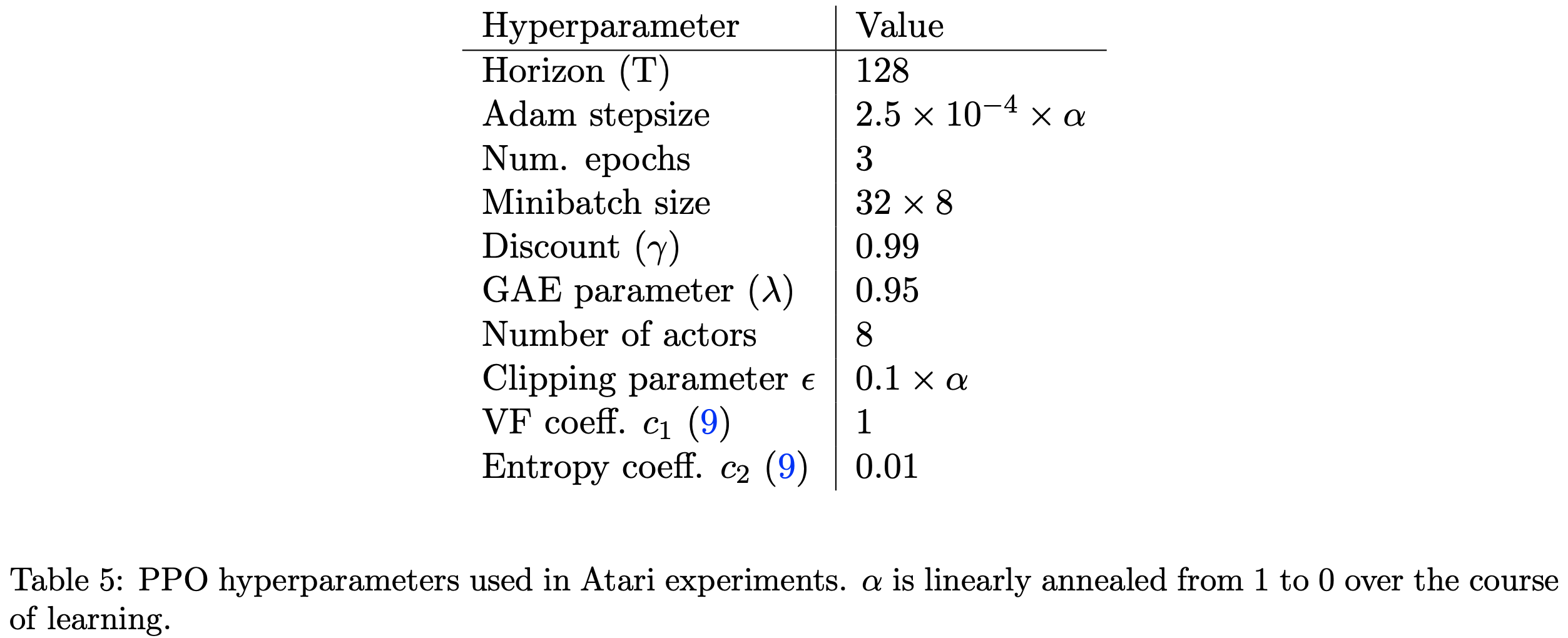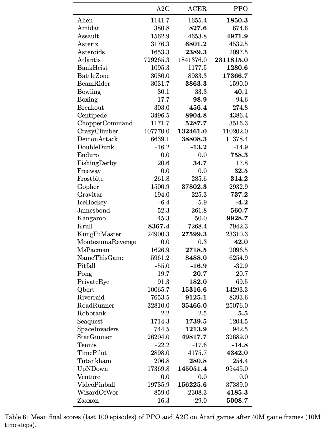 - 论文还在 Arcade Learning Environment 基准测试上运行了 PPO,并与调优良好的 A2C 和 ACER 实现进行了比较