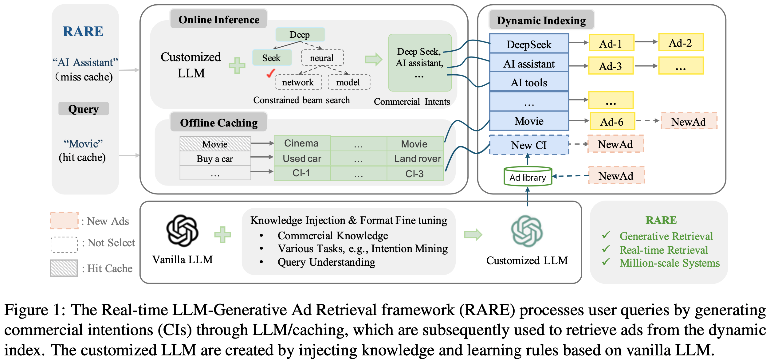 • 离线为广告生成 CIs,构建索引 :RARE 首先使用注入知识的LLM(离线)为语料库中的广告生成 CIs ,随后筛选出一组有限但全面的 CIs,并构建一个动态索引 ,将这些 CIs 以 one-to-many 的关系映射到对应的广告