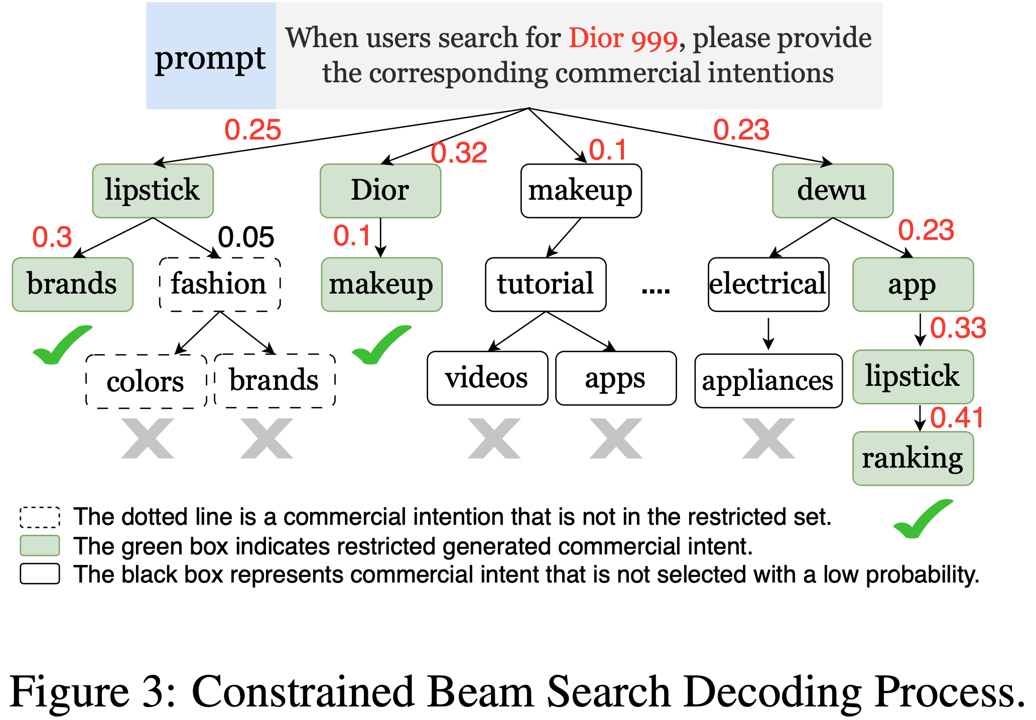 • constrained beam search :本工作采用 constrained beam search 算法生成商业意图(CIs),确保模型输出限定在预定义的 CIs 集合内