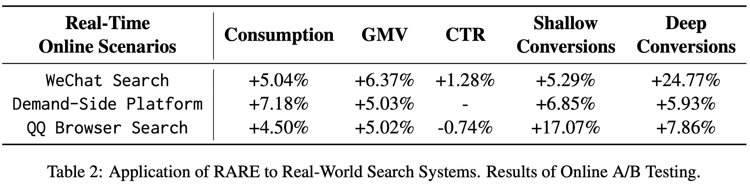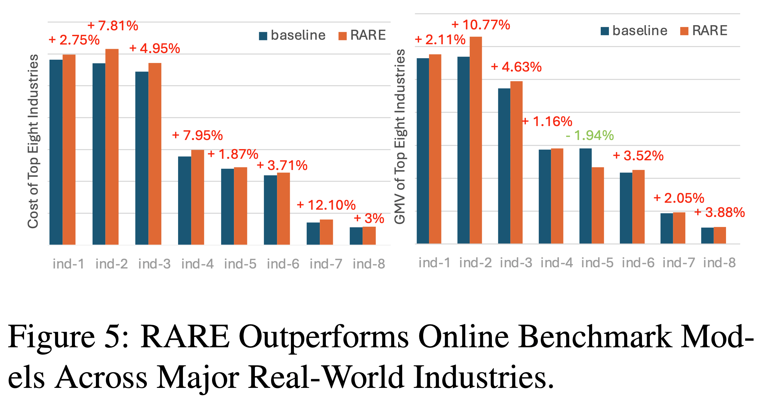 • 需求方平台(DSP)QQ浏览器搜索(QBS) :也观察到显著收益(表2),图5进一步展示了 RARE 在八大行业的有效性