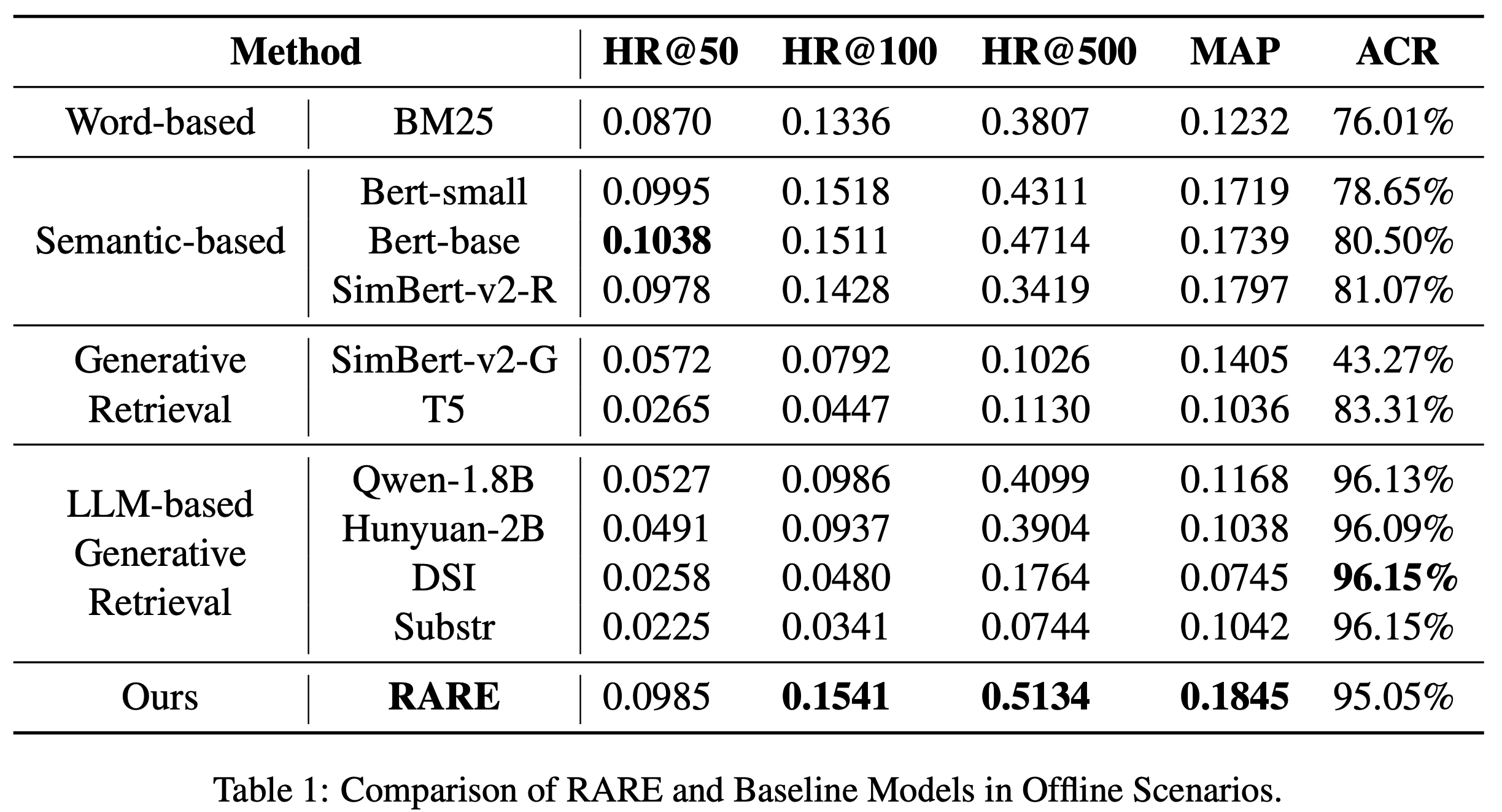 • 基线方法 :论文将 RARE 与 10 种竞争基线方法进行比较,涵盖四大类别,包括基于关键词的 BM25、基于语义的 BERT、基于生成的 T5 以及 LLM-based 的 Qwen 等