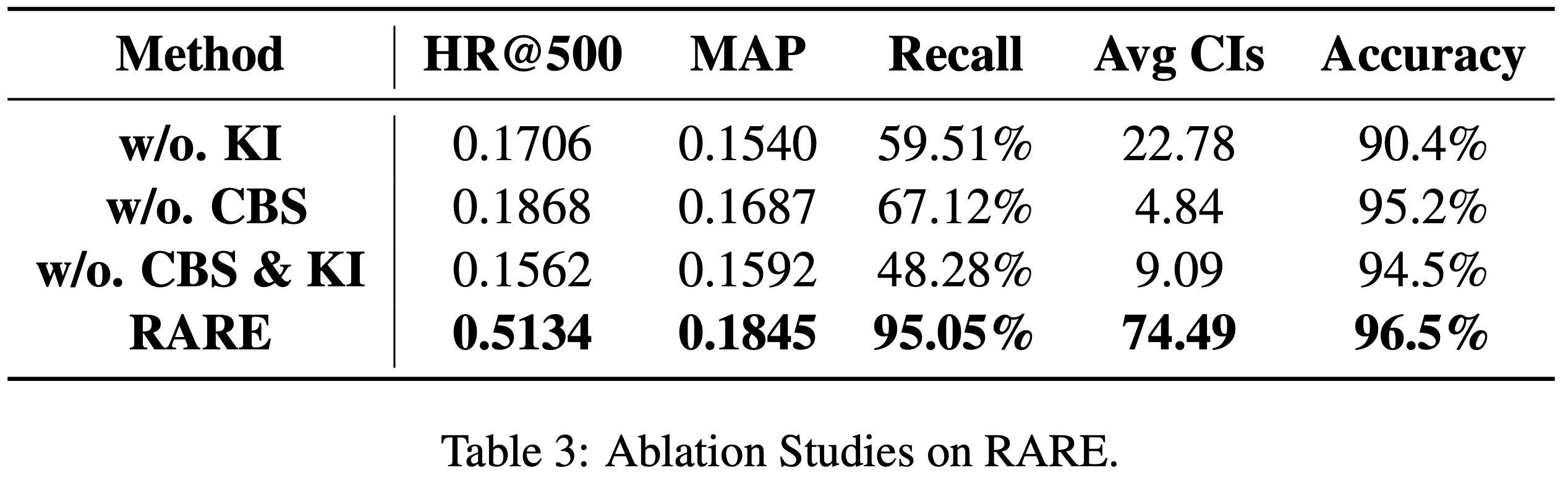 • w/o. CBS & KI :HR@500、MAP 和 ACR 均为最低