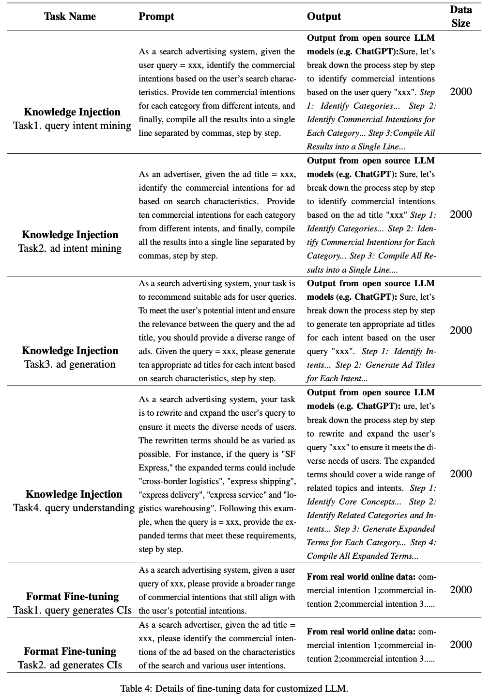 • 训练数据集 :为了使基础LLM具备商业知识,论文使用了商业知识和合成数据。原始数据来自真实在线日志,通过开源LLM执行 Query 意图挖掘和广告意图挖掘等任务生成最终合成数据。格式微调主要涉及 Query 和广告的商业意图(CIs),这些数据来自真实在线交互,并按固定规则组合。详情参见附录A的表4