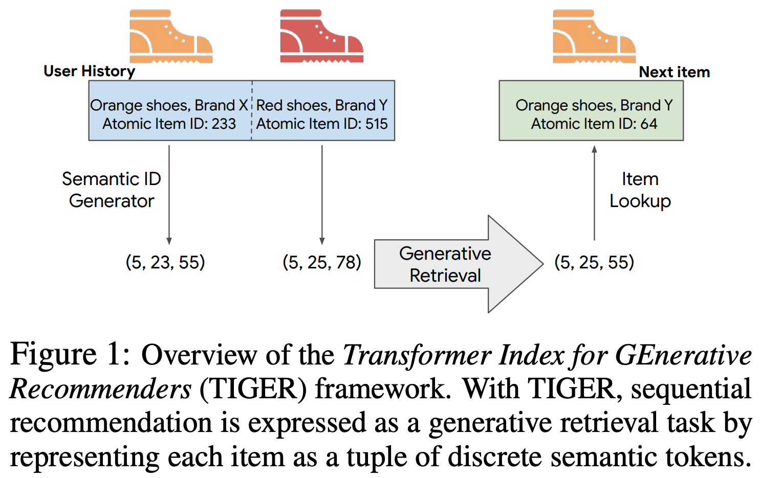 - 论文提出了TIGER ,一种基于生成式检索的推荐框架,为每个内容分配语义 ID,并训练检索模型预测用户可能交互的内容的语义 ID