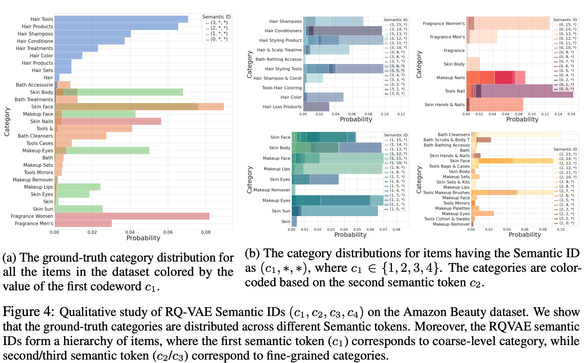 - 论文在图4中分析了为亚马逊“美容”数据集学习的RQ-VAE语义 ID 。为了说明,论文将RQ-VAE的级别数设为3,codebook 大小分别为4、16和256,即对于物品的语义 ID \((c_1, c_2, c_3)\),有 \(0 \leq c_1 \leq 3\),\(0 \leq c_2 \leq 15\) 和 \(0 \leq c_3 \leq 255\)。在图4a中,论文使用 \(c_1\) 标注每个物品的类别,以可视化数据集中整体类别分布中 \(c_1\) 特定的类别。如图4a所示,\(c_1\) 捕捉了物品的高级类别。例如,\(c_1 = 3\) 包含大部分与“头发”相关的产品,而 \(c_1 = 1\) 的物品主要是面部、唇部和眼部的“化妆品”和“护肤”产品