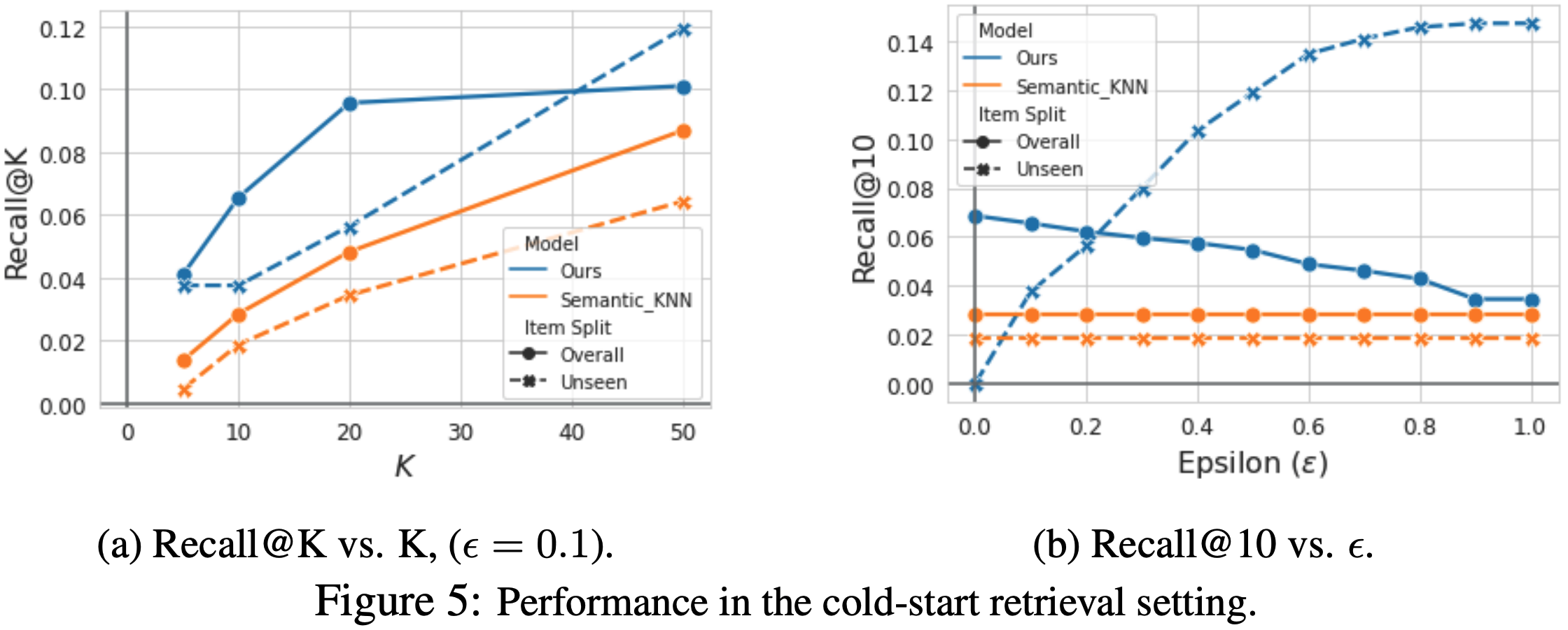 - 论文在图5中将TIGER与k近邻(KNN)方法在冷启动推荐设置下的性能进行了比较。对于KNN,论文使用语义表示空间执行最近邻搜索。论文将基于KNN的基线称为Semantic_KNN。图5a显示,论文的框架在 \(\epsilon = 0.1\) 时在所有Recall@K指标上始终优于Semantic_KNN。在图5b中,论文比较了不同 \(\epsilon\) 值下论文的方法与Semantic_KNN的表现。对于所有 \(\epsilon \geq 0.1\) 的设置,论文的方法均优于基线