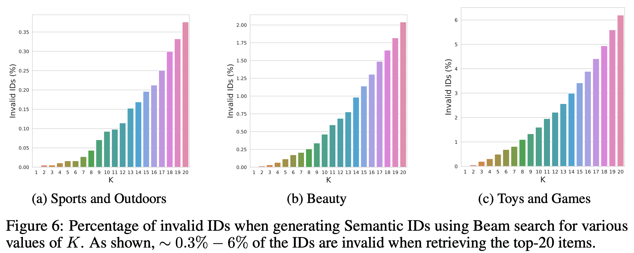 在论文的实验中,论文使用了长度为4的语义 ID,每个码字的基数为256(即每级 codebook 大小为256),这个组合可能的 ID 数量为 \(256^4\),约为4万亿。而论文考虑的数据集中的物品数量为10K-20K(见表6)。尽管有效 ID 数量仅占完整 ID 空间的一小部分,但论文观察到模型几乎总是预测有效 ID 。论文在图6中可视化了TIGER生成的无效 ID 比例随检索物品数量 \(K\) 的变化。对于Top-10预测,三个数据集的无效 ID 比例在约0.1%至1.6%之间变化。为了抵消无效 ID 的影响并始终获得Top-10有效 ID,我们可以增加束大小并过滤无效 ID (注:尽管生成无效 ID,TIGER在仍优于已有序列推荐方法)