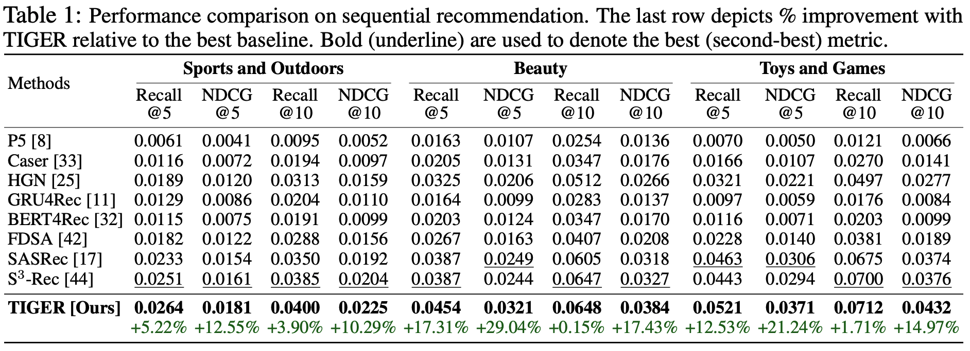 - 论文证明TIGER在多个数据集上的召回率和NDCG指标均优于现有的SOTA推荐系统