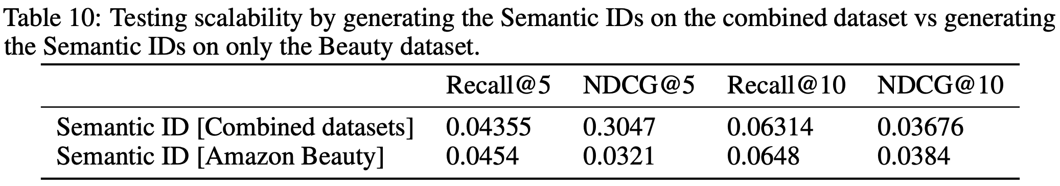 - 可扩展性 :为测试语义 ID 的可扩展性,论文进行了以下实验:合并三个数据集,并为所有物品生成语义 ID 。然后,论文在美妆数据集上使用这些语义 ID 进行推荐任务。将实验结果与仅基于美妆数据集生成语义 ID 的原始实验进行对比,结果如表10所示。论文发现性能仅有小幅下降