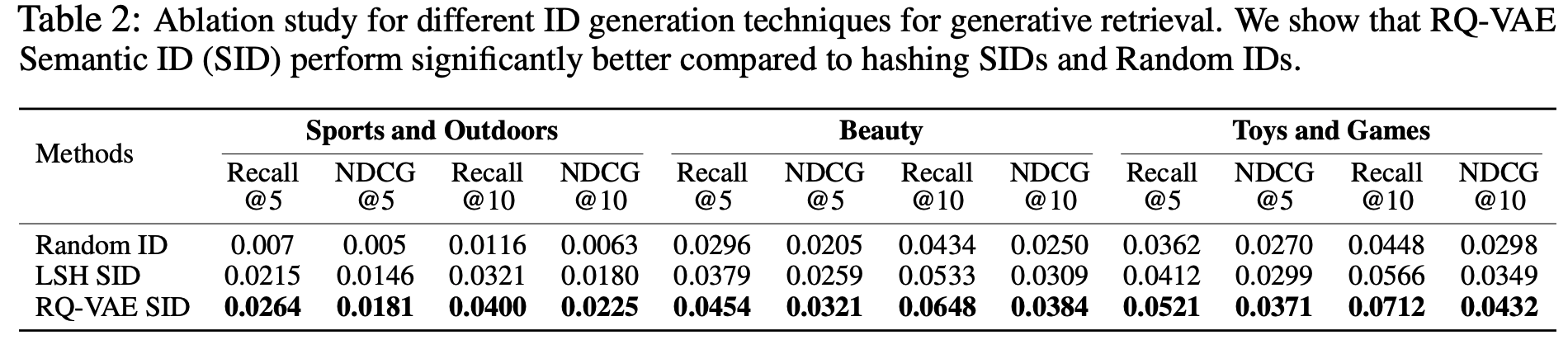 - *随机 ID 与语义 ID * :论文还比较了语义 ID 在生成式检索推荐系统中的重要性。具体而言,论文将随机生成的 ID 与语义 ID 进行比较。为了生成随机 ID 基线,论文为每个物品分配 \(m\) 个随机码字。物品的长度为 \(m\) 的随机 ID 为 \((c_1, \ldots, c_m)\),其中 \(c_i\) 从 \(\{1, 2, \ldots, K\}\) 中均匀随机采样。论文为随机 ID 基线设置 \(m = 4\) 和 \(K = 255\),以使基数与RQ-VAE语义 ID 相似。表2展示了随机 ID 与RQ-VAE和LSH语义 ID 的比较。论文发现语义 ID 始终优于随机 ID 基线,突出了利用基于内容的语义信息的重要性