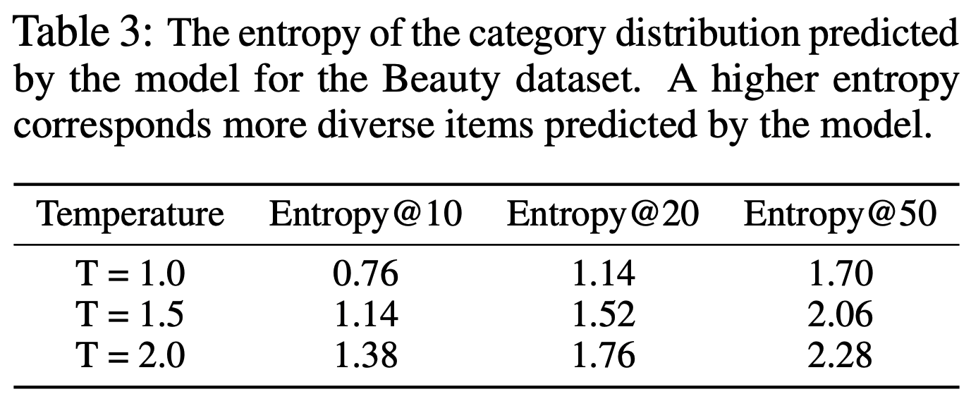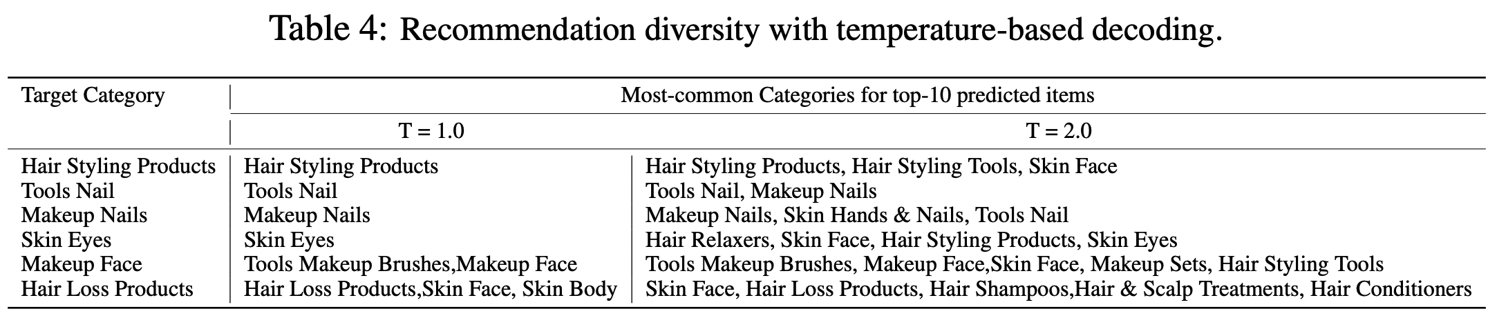 - 论文使用Entropy@K指标定量测量预测的多样性,其中熵是根据模型预测的Top-K物品的真实类别分布计算的。论文在表3中报告了不同温度值下的Entropy@K。论文观察到,在解码阶段使用温度采样可以有效增加物品真实类别的多样性。论文还在表4中进行了定性分析