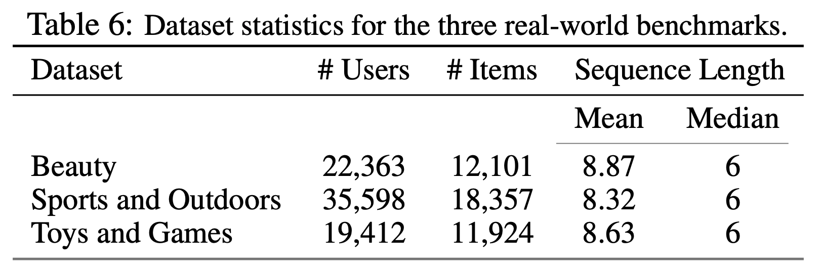 - 论文使用Amazon产品评论数据集[10]中的三个公开基准,包含1996年5月至2014年7月的用户评论和物品元数据。针对序列推荐任务,论文选择了三个类别:“美妆”、“运动与户外”和“玩具与游戏”。表6总结了数据集的统计信息。论文按时间戳对用户的评论历史进行排序并过滤出评论少于5条的用户。遵循标准评估协议[17, 8],论文采用留一法进行评估。对于每个物品序列,最后一个物品用于测试,倒数第二个用于验证,其余用于训练。训练时,论文将用户历史中的物品数量限制为20