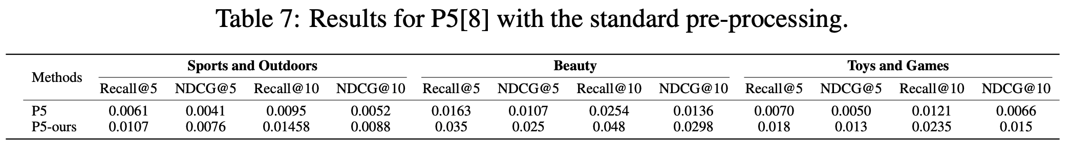 - 为解决泄露问题,论文改为为物品分配随机整数 ID,然后划分训练和评估集。P5的其余代码与论文提供的源代码保持一致。该数据集的结果在表7中以“P5”行显示。论文还从头实现了P5的一个版本,并仅针对序列推荐任务训练模型。论文的实现结果 token 为“P5-ours”。论文还在实现中验证,使用连续整数序列作为物品 ID 可以帮助论文获得与P5报告相当的或更好的指标