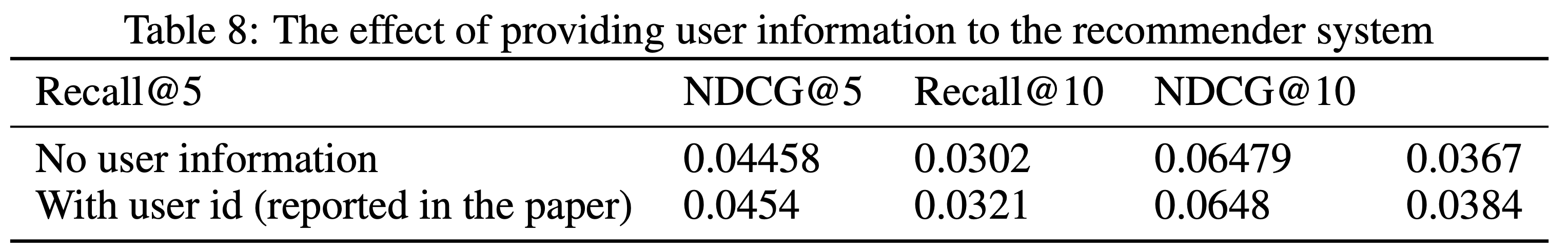 - 论文还测量了提供用户信息的效果,结果见附录中的表8